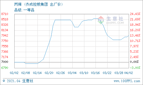4月2日,齊成控股集團(tuán)丙烯最新報(bào)價(jià)上調(diào),漲50元/噸至7950元/噸。