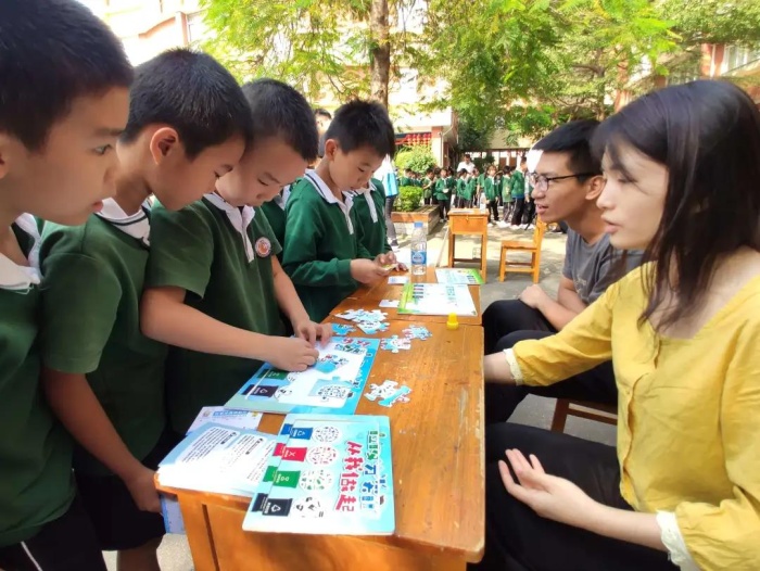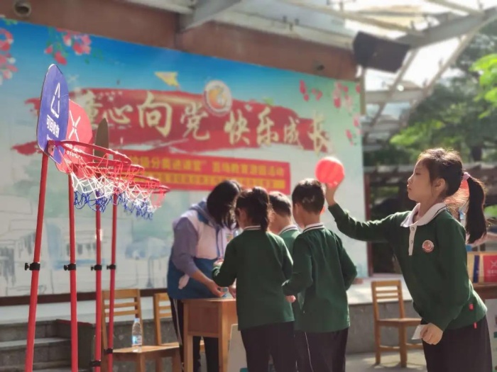 志愿者們以一個(gè)個(gè)垃圾分類實(shí)例作導(dǎo)引,向同學(xué)們講解垃圾分類的相關(guān)知識(shí),并分發(fā)垃圾分類宣傳手冊(cè)。實(shí)踐驗(yàn)真知,蘊(yùn)含垃圾分類知識(shí)的趣味游戲?qū)⒒顒?dòng)推向高潮?,F(xiàn)場不僅有益智的“垃圾分類大轉(zhuǎn)盤”“垃圾分類模擬投放”“垃圾分類有獎(jiǎng)問答”,還有動(dòng)腦又動(dòng)手的“垃圾分類拼圖游戲”和“垃圾分類跳飛機(jī)”“垃圾分類投籃”,各種趣味小游戲吸引了同學(xué)們的熱情參與,現(xiàn)場氣氛熱烈,同學(xué)們?cè)谟螒蚧?dòng)中不斷鞏固垃圾分類知識(shí)。在“垃圾分類有獎(jiǎng)問答”游戲環(huán)節(jié),同學(xué)們聚精會(huì)神,根據(jù)志愿者的口令或問題,準(zhǔn)確回答垃圾分類的問題,不僅考驗(yàn)了大家對(duì)垃圾分類的了解,也鍛煉了反應(yīng)能力,小朋友們玩得不亦樂乎。