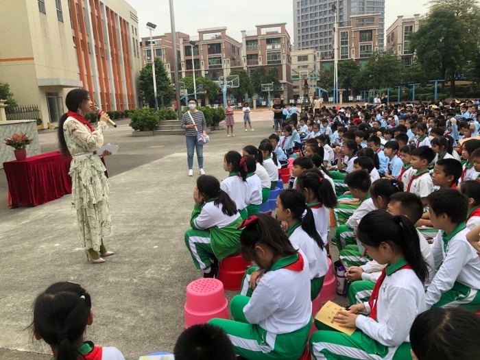 上午10:10,伴著一陣陣熱烈的掌聲,著名兒童文學(xué)作家郁雨君老師來(lái)啦!語(yǔ)文科組副組長(zhǎng)楊秋云老師主持活動(dòng)并詳細(xì)介紹了郁雨君老師的優(yōu)秀作品。少先隊(duì)員代表為郁老師佩戴紅領(lǐng)巾,向辮子姐姐獻(xiàn)上最崇高的隊(duì)禮。
