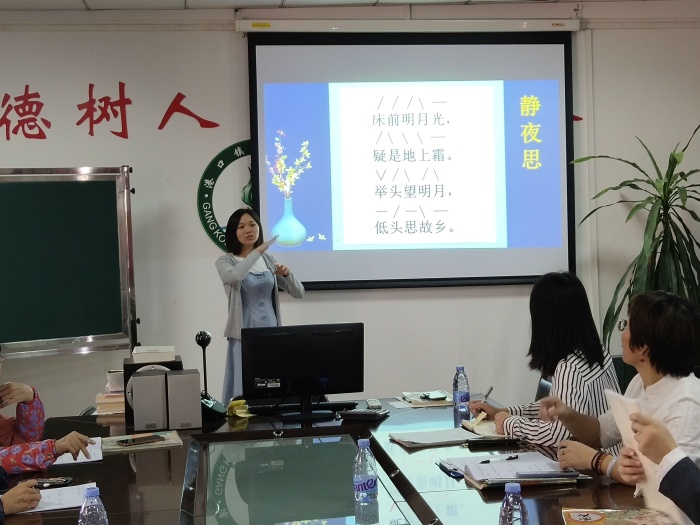 講到精彩之處,李老師以古詩《靜夜思》為例,通過不斷比劃普通話聲調(diào)的同等手勢(shì),帶領(lǐng)全體語文教師一邊比手勢(shì)一邊吟誦詩歌。這種有趣又實(shí)用的教學(xué)方法,使整個(gè)會(huì)議室的氣氛活躍起來。