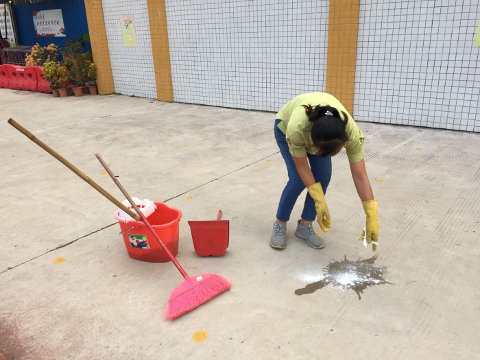 值日老師指引在校道放學的學生讓開一條通道,讓班主任帶嘔吐學生到隔離區(qū)等候,戴好手套幫學生測量體溫,隨即電話通知家長過來帶學生到醫(yī)院看病。同時,值日老師立馬打電話通知值日行政,值日行政再通知清潔阿姨馬上過來對嘔吐物進行清理消毒。學校按照疫情防控工作專班的工作處置流程要求,逐級匯報。學校相關領導和部門迅速響應,啟動應急預案,按流程處置。這次應急演練,學校各成員職責明確、流程清晰、協(xié)同有力、處置得當,達到了預期效果。
