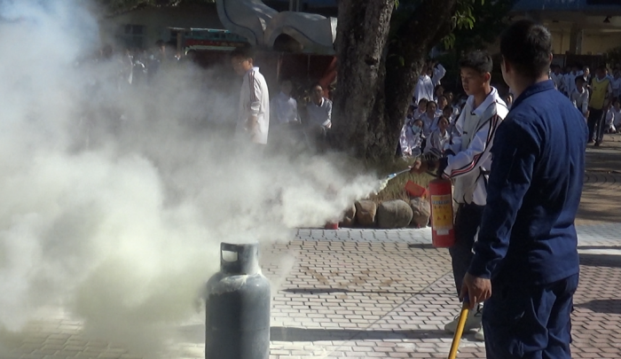 隨后劉啟堂指導(dǎo)員手把手地指導(dǎo)教職員工、學(xué)生進(jìn)行滅火實操演練。管德豐校長、賴其森主任、教師、廚師、保安、教官和學(xué)生代表,紛紛拿起滅火器,對著熊熊烈火噴射干粉,火立即被撲滅,然后迅速擰緊煤氣罐。廣大教職員工、學(xué)生實操演練熱情高漲,在實操中,感受到火勢的兇猛和滅火器的威力,滅火的正確姿勢,從而提高了火災(zāi)處理應(yīng)變能力。