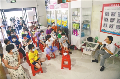 聽說小區(qū)服務(wù)站將會舉辦主題宣講活動,朱端陽早早就帶著7歲的外孫女郭錦若前來“搶占前排”?!拔覀儚男【徒o孩子講一些名著故事,同時給她看一些簡短的偉人故事,希望她能學(xué)習(xí)偉人身上的優(yōu)秀品質(zhì),同時幫助她樹立愛黨、愛國的意識”。朱端陽說,書展結(jié)合黨史故事宣傳進小區(qū)的模式,在培育和激發(fā)孩子們愛黨、愛國情懷的同時,也能讓孩子們明白當今的幸福生活來之不易,希望平時也能多舉辦一些這樣有意義的活動。