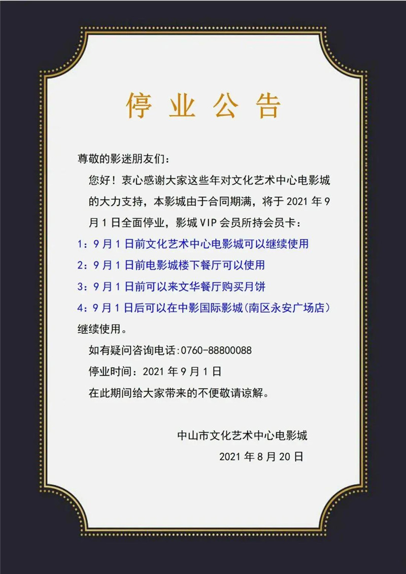 8月21日,不少市民向中山日報報料稱,中山市文化藝術中心電影城近日發(fā)布了停業(yè)公告,稱影城由于合同期滿,將于2021年9月1日全面停業(yè)。
