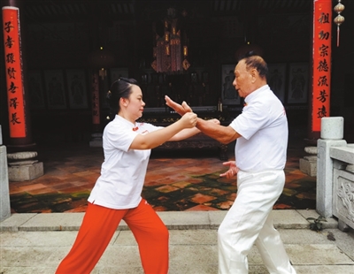 “食過夜粥”(粵俗語,指會功夫、懂武術(shù))的武林中人,總會用生動、地道的方言來描述他們熱愛的功夫,劉家拳中就有一句拳諺“蠄蟧爪(蠄蟧粵語指的是一種蜘蛛,蠄蟧爪則是形容劉家拳的橋手快速敏捷)、蝦公腰(在腰力的運用上要有蝦腰一般的爆炸力)”。記者在拍攝時特意請蕭永定和他的孫女、劉家拳第五代傳承人蕭美泳一起來演繹這一動作特點。