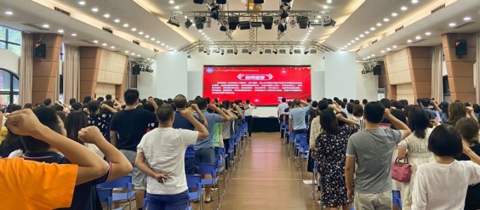 “不忘立德樹人初心,牢記為黨育人、為國育才使命,做到有理想信念、有道德情操、有扎實學(xué)識、有仁愛之心”。全體教職工高高舉起右拳,在馮子川的領(lǐng)誓下,莊嚴(yán)宣誓:“我志愿做一名光榮的人民教師,深入學(xué)習(xí)領(lǐng)會習(xí)近平新時代中國特色社會主義思想,忠誠黨的教育事業(yè),貫徹黨的教育方針……”一句句鏗鏘有力的誓詞,一聲聲篤信堅定的話語表達了教職工們以磐石初心堅定育新人的決心和信心,以昂揚奮進的姿態(tài)做新時代的好老師。