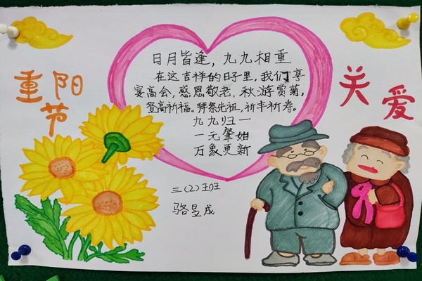 濃厚的重陽節(jié)氛圍激起了學生們的尊老、敬老、愛老、助老的強烈情感,他們通過制作手抄報的形式進一步表達心中的感恩之情。