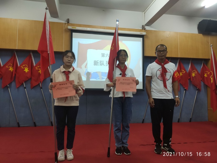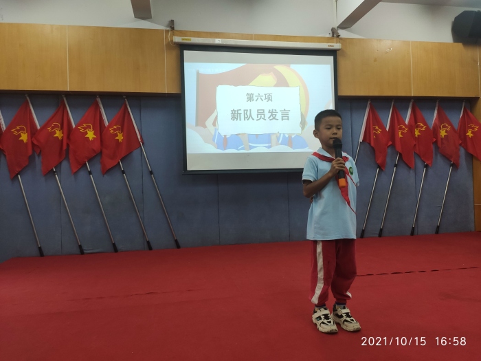 大隊(duì)輔導(dǎo)員林靜敏老師宣讀了新隊(duì)員入隊(duì)名單,并對(duì)新隊(duì)員入隊(duì)表示熱烈祝賀。在大隊(duì)輔導(dǎo)員的領(lǐng)下,在莊嚴(yán)的隊(duì)旗下,高高地舉起右手大聲宣誓,時(shí)刻準(zhǔn)備著為共產(chǎn)主義事業(yè)而奮斗!接著由新隊(duì)員代表林永輝同學(xué)和老隊(duì)員代表李文駿同學(xué)做了精彩的發(fā)言,梁廣平主任對(duì)新晉中隊(duì)授予中隊(duì)旗并頒發(fā)聘書。最后再新隊(duì)員堅(jiān)定的呼號(hào)聲中結(jié)束了本次的儀式,相信他們能在星星火炬的指引下,牢記黨的教誨,全面發(fā)展,茁壯成長。