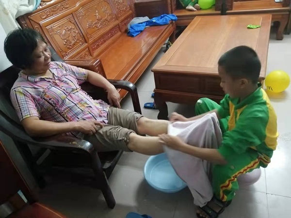 一到三年級(jí)的學(xué)生在家中對(duì)父母長(zhǎng)輩說(shuō)說(shuō)藏在心中的溫暖話語(yǔ),為長(zhǎng)輩做一些力所能及的家務(wù)。四到六年級(jí)的學(xué)生了解家中長(zhǎng)輩的興趣愛(ài)好與心愿期望,并且親手為父母長(zhǎng)輩做一道他們喜歡的菜。一道道精致的菜肴,一片片感恩敬老之意。雖然有的同學(xué)廚藝略顯稚拙,但是其中包含著對(duì)家人濃濃的親情愛(ài)意。