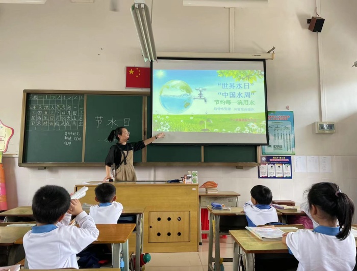 班會一開始,班主任用謎語來調(diào)動起學(xué)生們對水的興趣,還用PPT圖文并茂為孩子們講解。班主任強調(diào)“雖然世界水日是3月22日,但是對于我們來說,每一天都是節(jié)水日?!薄拔覀?yōu)槭裁匆?jié)水?”“為什么會缺水?”緊接著一連串的反問句,讓每個學(xué)生都對這節(jié)主題班會課充滿了好奇?!耙驗槲覀冇盟唷!薄耙驗楹芏嗳死速M水?!薄瑢W(xué)們給出了自己的答案?!按蠹抑绬幔覀儑沂且粋€缺水的國家,而水孕育生命,一切生命都離不開水。所以我們通過這種形式,來號召人們節(jié)約用水,并合理利用水資源?!卑嘀魅蔚脑捵寣W(xué)生們認識到了水的用途和重要性,而關(guān)于水的故事更是引得孩子們睜大了眼睛。班主任用生動的語言,向?qū)W生們講述了各種與水有關(guān)的故事,水的來源、水的種類以及我們的生活用水是如何產(chǎn)生的,還用互動的方式,提出各種問題,讓同學(xué)們回答,便于學(xué)生記住更多關(guān)于水的知識。