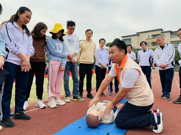 接下來,學(xué)校邀請(qǐng)廣東伍玖伍安全文化科技有限公司培訓(xùn)人員進(jìn)行應(yīng)急救護(hù)培訓(xùn)活動(dòng),培訓(xùn)志愿者們邊講解邊指導(dǎo)學(xué)生體驗(yàn)了消防帳篷、逃生防毒面具試戴、模擬觸電、滅火器使用等場景。在這種互動(dòng)式體驗(yàn)活動(dòng)中,學(xué)生們興致盎然,參與度高。學(xué)生們既獲得了安全知識(shí)教育,又獲得了應(yīng)急操作經(jīng)驗(yàn)。培訓(xùn)志愿者對(duì)老師們進(jìn)行了心肺復(fù)蘇、人工呼吸、海姆立克法的培訓(xùn),通俗易懂的講解,很快教會(huì)了老師們掌握不少急救的技巧和規(guī)范性的操作。