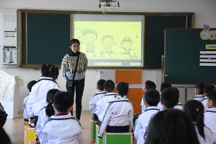 此次活動在觀摩課例中拉開序幕。孫美婷老師為全體老師展示了人民音樂出版社一年級下冊第七課歌曲《粉刷匠》一課。孫老師結(jié)合柯達伊音樂教學法,讓學生初步認識五線譜并認知s-m-d三音在五線譜中的位置,并能用準確的聲音學會歌曲。課堂上充分應(yīng)用了信息技術(shù)希沃白板融合教學,鼓勵學生積極動手探究,培養(yǎng)學生的音樂素養(yǎng)。