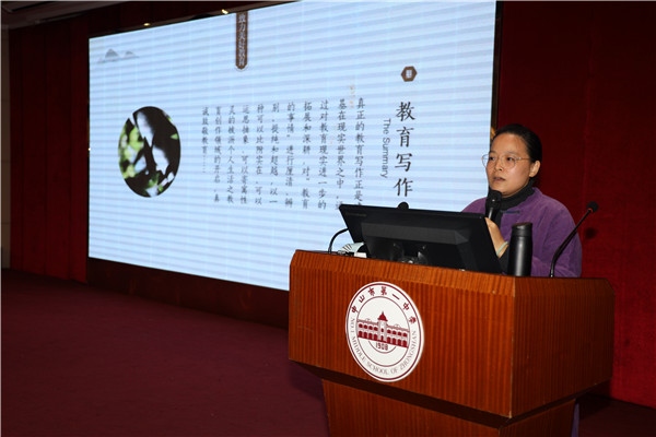 講座中,李淳女士從“積蘊(yùn)人文的精神、開(kāi)啟自我的教育、保留思考的過(guò)程、突破無(wú)形的框限、接壤生活的世界、提出切己的問(wèn)題、朝向未來(lái)的自由”等七個(gè)方面為在場(chǎng)老師們介紹了自己對(duì)于教育寫(xiě)作的認(rèn)識(shí)和看法。她指出教育寫(xiě)作是對(duì)教育現(xiàn)實(shí)的進(jìn)一步拓展,廣大教師要自覺(jué)進(jìn)行自我教育,在教育寫(xiě)作的過(guò)程中要將教學(xué)現(xiàn)場(chǎng)具化。教育寫(xiě)作沒(méi)有固定的模式,要接近現(xiàn)實(shí),貼近人性。講座過(guò)程中,李淳女士還精心選擇了一些優(yōu)秀的教育文章進(jìn)行現(xiàn)場(chǎng)分享,讓教師們更直觀地感受優(yōu)秀教育寫(xiě)作的特點(diǎn),更進(jìn)一步體會(huì)到教育寫(xiě)作應(yīng)該具有的場(chǎng)景性、真實(shí)性、人文性。李淳女士還結(jié)合實(shí)際,指出老師在教育寫(xiě)作的過(guò)程中往往會(huì)面臨功利排斥、定位過(guò)高、理性壓迫等教育寫(xiě)作困境,她針對(duì)這些困境提出了相應(yīng)的應(yīng)對(duì)策略,鼓勵(lì)老師們多多進(jìn)行有質(zhì)量、有情懷的教育寫(xiě)作。李淳女士還向老師們介紹了《師道》雜志師者情懷、書(shū)生氣象、草根力量的辦刊風(fēng)格,指出《師道》雜志注重老師的人文情懷,注重對(duì)一線老師的鼓勵(lì),希望老師們能多投稿,在《師道》中架起一座用學(xué)術(shù)、用人文教育寫(xiě)作架起的教育工作者之間溝通的橋梁。