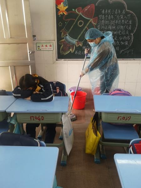 課室是學(xué)生主要的活動(dòng)場(chǎng)所,演練第二階段,模擬任課教師上課期間,在教室里發(fā)現(xiàn)一學(xué)生萎靡不振,咳嗽,渾身發(fā)冷并伴有流感樣癥狀,馬上安排孩子與其他學(xué)生保持安全距離。將學(xué)生帶到校內(nèi)隔離點(diǎn),并通知相關(guān)負(fù)責(zé)領(lǐng)導(dǎo)。同時(shí),班主任重點(diǎn)對(duì)教室進(jìn)行消殺。