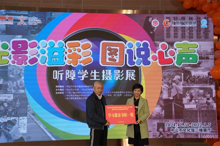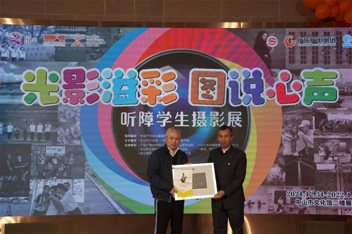 頒牌儀式上,中山市文化館為支持單位廣東廣電網(wǎng)絡(luò)中山市分公司授予感謝匾牌,歐派家居集團股份有限公司中山分公司為市特校捐贈課桌椅一批。隨后,引領(lǐng)聽障孩子入門的珠?!翱扉T無聲”公益項目創(chuàng)始人朱習(xí)女士對孩子們的成長表示驚喜和欣慰,“光影溢彩 圖說心聲”聽障學(xué)生攝影培訓(xùn)項目負(fù)責(zé)人、本次攝影展主要策展人之一賀億強先生表達了自己的感謝與激動,并對聽障孩子今后攝影學(xué)習(xí)作了詳細規(guī)劃?;顒又?,嘉賓與學(xué)生代表共同為本次開幕式剪彩,接著嘉賓們一同步入展區(qū),靜心賞鑒聽障孩子們用眼睛“聽到”的世界,用鏡頭記錄的生活,為明媚綻放的生命之光點贊!