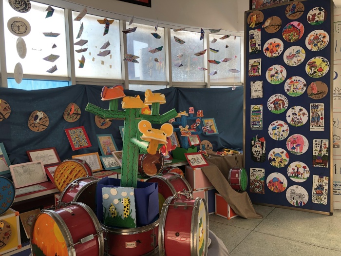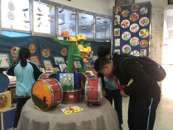 除此之外,安阜小學(xué)本次元旦畫(huà)展的一大亮點(diǎn)是傳達(dá)了環(huán)保的理念:學(xué)校美術(shù)興趣小組的同學(xué)們?cè)诶蠋煹膸ьI(lǐng)下把鼓號(hào)隊(duì)置換下來(lái)的舊小鼓變成了畫(huà)布,創(chuàng)作了一系列鼓面裝飾畫(huà)。為畫(huà)展增添了活潑的色彩。