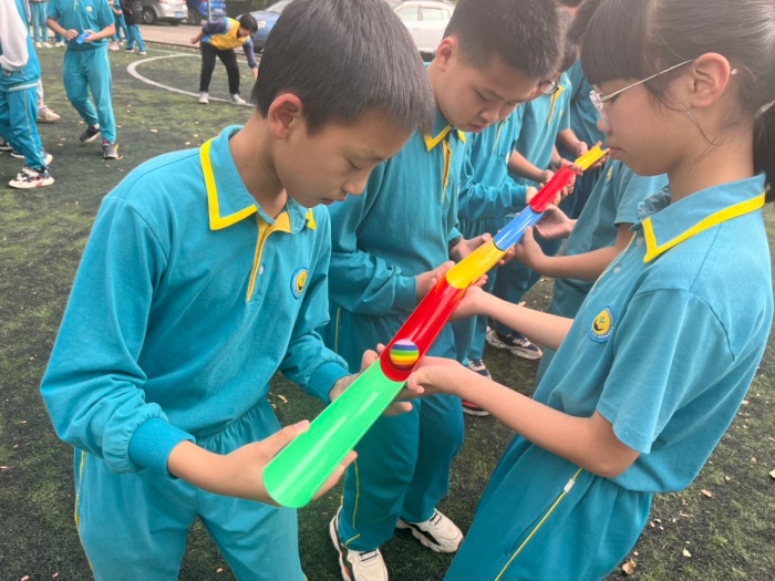 活動(dòng)中,通過抽簽的形式把同學(xué)們分成4個(gè)小組,每組自行選出隊(duì)長(zhǎng)、確定隊(duì)名和口號(hào),隨后的“珠行萬里”環(huán)節(jié),要求同學(xué)們分組站成一排,通過共同傳遞一個(gè)圓球,讓學(xué)員感受團(tuán)隊(duì)間的配合、銜接以及自我控制能力,是培養(yǎng)團(tuán)隊(duì)協(xié)作能力的游戲,這項(xiàng)游戲考驗(yàn)的是孩子們彼此接納、協(xié)同合作的能力,在愉悅的氛圍中孩子們悄悄感受溝通的重要性。