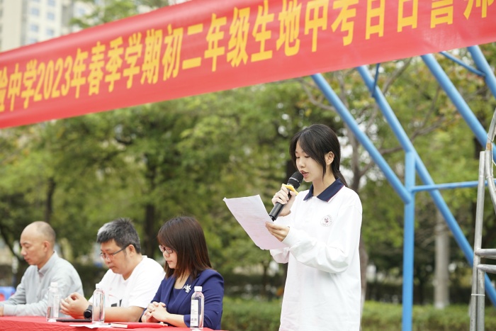 學(xué)生代表鄧玉彤同學(xué)認(rèn)為備戰(zhàn)生地中考的關(guān)鍵在于樹立目標(biāo),堅定信心,努力奮斗和及時改進(jìn)學(xué)習(xí)方法。她堅信初二學(xué)子必能以高昂的斗志、百倍的信心、扎實(shí)的基礎(chǔ),逐鹿考場,笑傲六月。