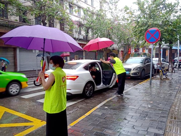強(qiáng)對流天氣帶來短暫性暴雨,學(xué)校護(hù)衛(wèi)隊堅守崗位,開始第一天的護(hù)校工作。為了保障順利開學(xué),早上6:50他們就早早來到高家基巷口,換好值日服裝,戴上防護(hù)手套,開始晨間工作。他們兵分多路,有的在路口疏導(dǎo)交通,有的引導(dǎo)家長有序停車,還有的護(hù)送學(xué)生過馬路。他們?nèi)藬?shù)不多,但是分工明確:一部分是負(fù)責(zé)協(xié)助路邊下車的學(xué)生,攔停機(jī)動車道車輛,以確保自身安全及學(xué)生能安全通行;另一部分是負(fù)責(zé)開關(guān)私家車車門,接送學(xué)生,以免造成道路擁堵。并且,由于在疫情期間,護(hù)衛(wèi)隊隊長特別強(qiáng)調(diào):“所有隊員在值崗過程中不能觸碰學(xué)生及學(xué)生物品,人與人間保持至少1米以上安全距離,戴一次性手套?!边@一個個細(xì)節(jié)展示了學(xué)校護(hù)衛(wèi)隊工作的細(xì)致、認(rèn)真和用心。