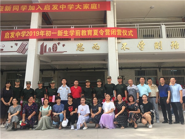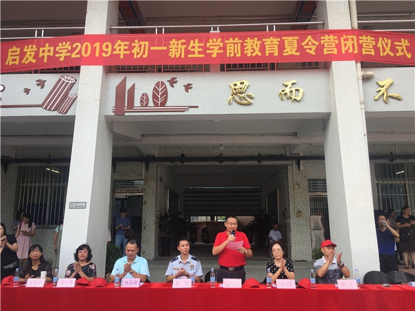 2019年8月29日下午,啟發(fā)中學(xué)初一新生學(xué)前教育夏令營閉營儀式正式拉開帷幕。參加本次閉營儀式的領(lǐng)導(dǎo)和嘉賓有:啟發(fā)中學(xué)校長謝永芳、城區(qū)消防中隊(duì)隊(duì)長蔡洋、啟發(fā)中學(xué)副校長祝玉珍、啟發(fā)中學(xué)副校長林容森、啟發(fā)中學(xué)教務(wù)處主任鄧小斐、啟發(fā)中學(xué)德育處副主任馬健媛;學(xué)校全體行政、全體教官、班主任和初一年級全體新生;部分新生家長也積極參加了本次閉營儀式。