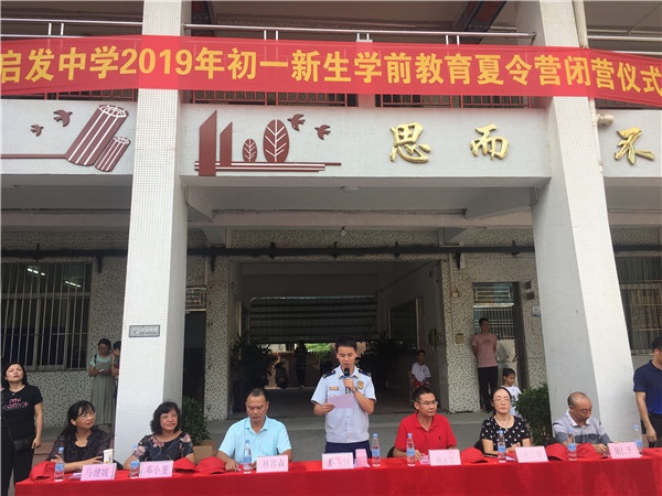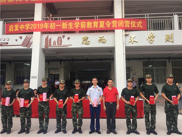 隨后匯操比賽頒布了各項(xiàng)獎項(xiàng),分別頒發(fā)了優(yōu)秀教官“榮譽(yù)證書”及紀(jì)念品、匯操比賽獎、最佳指揮員獎、優(yōu)秀學(xué)員獎,由現(xiàn)場領(lǐng)導(dǎo)和嘉賓為獲獎教官和學(xué)生頒獎。頒獎完畢,啟發(fā)中學(xué)校長謝永芳作新生學(xué)前教育夏令營總結(jié)講話。最后由城區(qū)消防中隊(duì)隊(duì)長蔡洋宣布:啟發(fā)中學(xué)2019年初一新生學(xué)前教育夏令營圓滿成功,閉營!