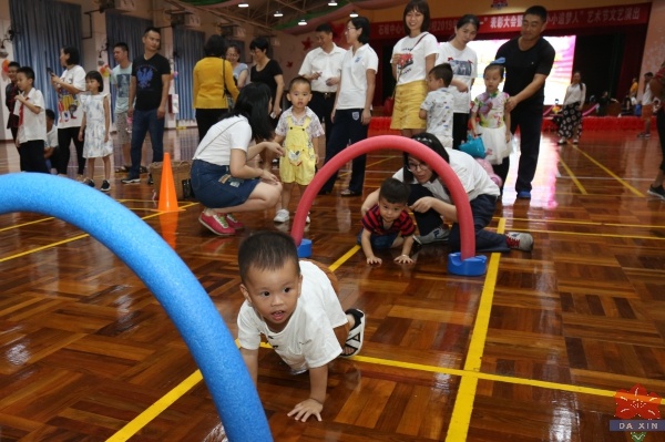 晚上7點(diǎn),大家紛紛來到了慶?;顒拥闹鲿?---大信學(xué)校體育館。迎接孩子們的是充滿著節(jié)日氣氛的大舞臺,每年的“六?一”所有的孩子都可以在這個大舞臺上一展才藝。隨著主持人的報(bào)幕聲響起,”現(xiàn)場立時成為一片歡樂的海洋!舞臺上傳來了小朋友的歌聲、朗通聲、街舞伴奏的音樂聲……小小年紀(jì)的寶貝們各有絕活,讓人羨慕!舞臺的對面是游園活動的主陣地,六位義工老師已經(jīng)準(zhǔn)備就緒,面帶微笑迎接參加游園活動的小伙伴們?!昂5姿淼馈庇螒蛭簧?,幾個步履蹣跚的小家伙在家長的指引下匍匐前進(jìn),居然能順利通關(guān);“毽球入筐”孩子們投筐姿勢各異,大一點(diǎn)兒的孩子毫無懸念飛投入筐,小一點(diǎn)兒的孩子也不甘示弱,竟然“近距離入甕”,再小一點(diǎn)兒的孩子甩出的毽球與筐完全不沾邊,引得在旁的家長們捧腹大笑?!白闱蛏溟T”“ 足球保齡球” “羽毛球顛球”每個攤位都有一群小粉絲,他們那專注的眼神,稚拙的動作,引得在場家長們的笑聲此起彼落,整個體育館沉浸在一片歡樂祥和中。
