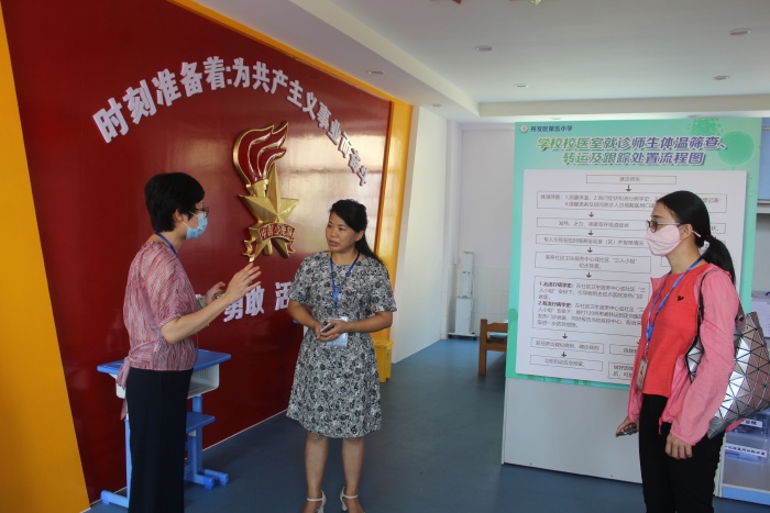 檢查組一行在胡冬梅副校長(zhǎng)的帶領(lǐng)下對(duì)學(xué)校的開學(xué)準(zhǔn)備、疫情防控、校園安全、規(guī)范管理以及師生返校等情況進(jìn)行了資料的查看,詳細(xì)詢問,實(shí)地查看了校園環(huán)境、食堂、保健室、留觀室、防疫物資儲(chǔ)備室等區(qū)域,檢查組對(duì)學(xué)校的工作給予了肯定,并就進(jìn)一步做好開學(xué)后秋季防疫工作提了建議,希望學(xué)校能進(jìn)一步統(tǒng)一思想,加強(qiáng)常態(tài)化疫情防控管理,確保開學(xué)工作有序、安全、穩(wěn)定。