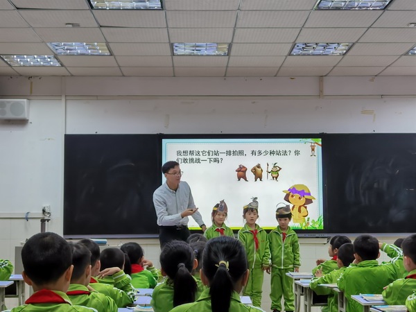 陳浩亮老師的數(shù)學(xué)課《搭配》,課堂活動多樣化,手段靈活。他讓同學(xué)們在觀察、猜測、動手操作的活動中,找出最簡單的事物排列規(guī)律。無論是數(shù)字王國闖關(guān),還是給樹城堡、花城堡涂色,給熊大、熊二、奇奇拍照,都把數(shù)學(xué)知識放到活動中教學(xué),充分調(diào)動學(xué)生積極性。