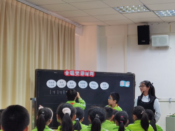 想要合理地安排時間,找到最優(yōu)方案,那就一起去曾彩鳳老師的數(shù)學(xué)課堂上看看吧。從“沏茶”,到“吃感冒藥”,到“媽媽做飯”,情境一個接一個,學(xué)生在小活動中很快體會到高深的“統(tǒng)籌學(xué)”知識。曾老師充分發(fā)揮電子白板的優(yōu)勢,充分配合教學(xué),效果突出。
