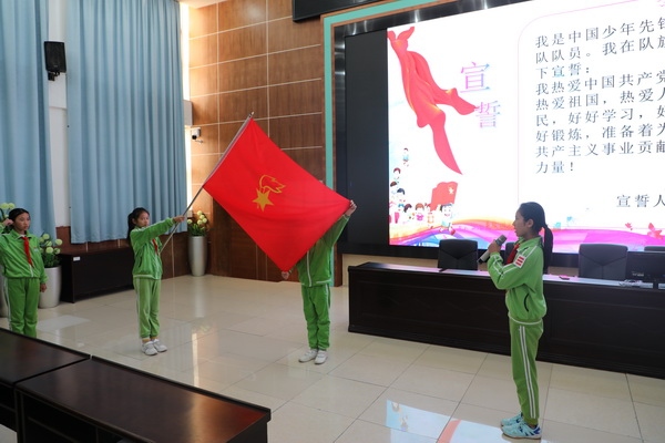 伴隨著嘹亮的出隊(duì)旗曲,旗手和護(hù)旗手們邁著整齊、鏗鏘有力的步伐出場(chǎng)。緊接著,全體隊(duì)員起立,高唱隊(duì)歌,新隊(duì)員們精神飽滿,歌聲洪亮,唱出了心中的自豪和對(duì)少先隊(duì)組織的無(wú)比熱愛(ài)。少先隊(duì)大隊(duì)長(zhǎng)王敏喬同學(xué)宣讀完新隊(duì)員名單后,六年級(jí)優(yōu)秀少先隊(duì)員代表為新隊(duì)員戴上了鮮艷的紅領(lǐng)巾。戴上紅領(lǐng)巾的新隊(duì)員們個(gè)個(gè)精神抖擻,臉上洋溢著幸福和自豪的笑容。在副大隊(duì)長(zhǎng)趙梓默的帶領(lǐng)下,新隊(duì)員們?cè)陉?duì)旗下莊嚴(yán)宣誓,老隊(duì)員重溫入隊(duì)誓詞。宣誓結(jié)束后,少先隊(duì)總輔導(dǎo)員杜沁源老師講話,她對(duì)新隊(duì)員們加入少先隊(duì)組織表示祝賀并提出了殷切的希望,希望新隊(duì)員們?cè)谛切腔鹁嫫鞄玫闹敢?,踏著先輩的足跡,以嚴(yán)格的標(biāo)準(zhǔn)規(guī)范自己的行為,努力學(xué)習(xí),勇敢前進(jìn),學(xué)會(huì)感恩,珍惜生命,牢記自己的光榮使命。最后,全體隊(duì)員在杜老師的帶領(lǐng)下齊聲呼號(hào)。