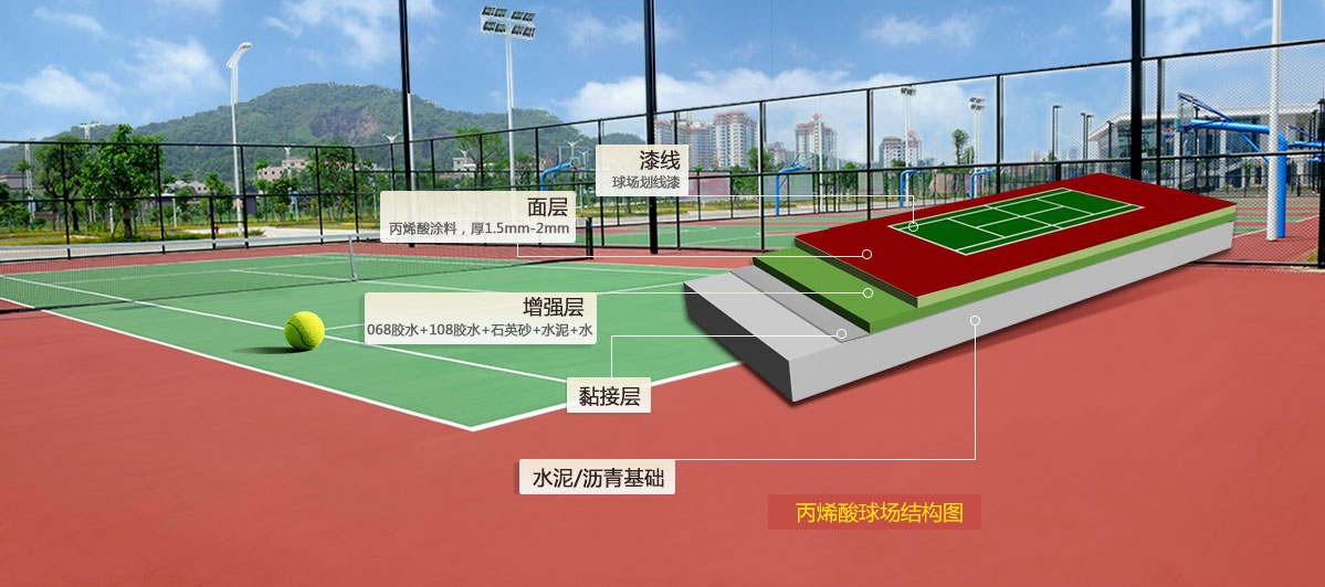 基礎增強層:一種不含石棉.與石英砂混合使用的丙烯酸乳液鋪涂層具有滲透性好、強度大的特點,能增強場地的強度、平整度和使用壽命。