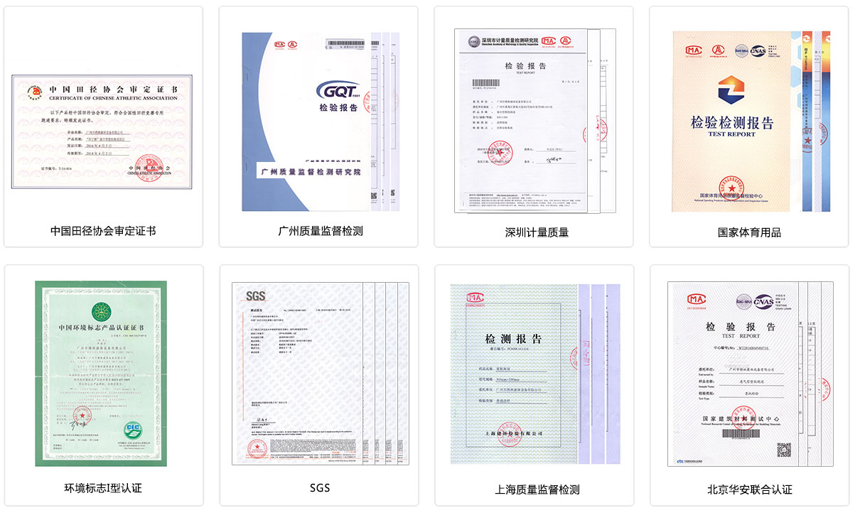 塑膠跑道獲得:中國(guó)田徑協(xié)會(huì)審定證書(shū)、廣州質(zhì)量監(jiān)督檢測(cè)、深圳計(jì)量質(zhì)量、國(guó)家體育用品、環(huán)境標(biāo)志I型認(rèn)證、SGS、上海質(zhì)量監(jiān)督檢測(cè)、北京華安聯(lián)合認(rèn)證等。