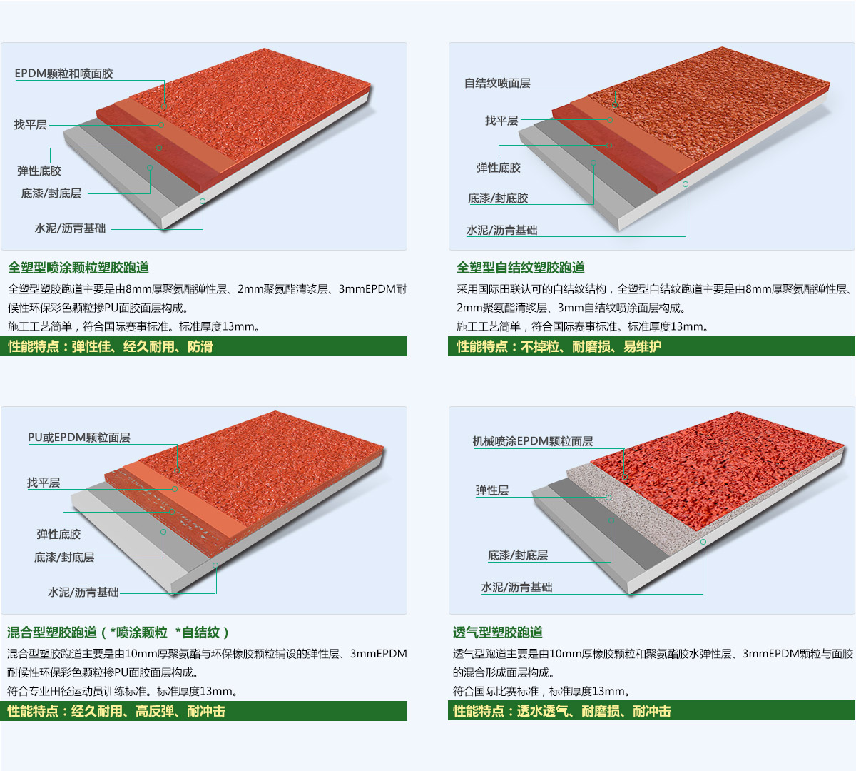 全塑型塑膠跑道、自結(jié)紋塑膠跑道、混合型塑膠跑道、透氣型塑膠跑道等。