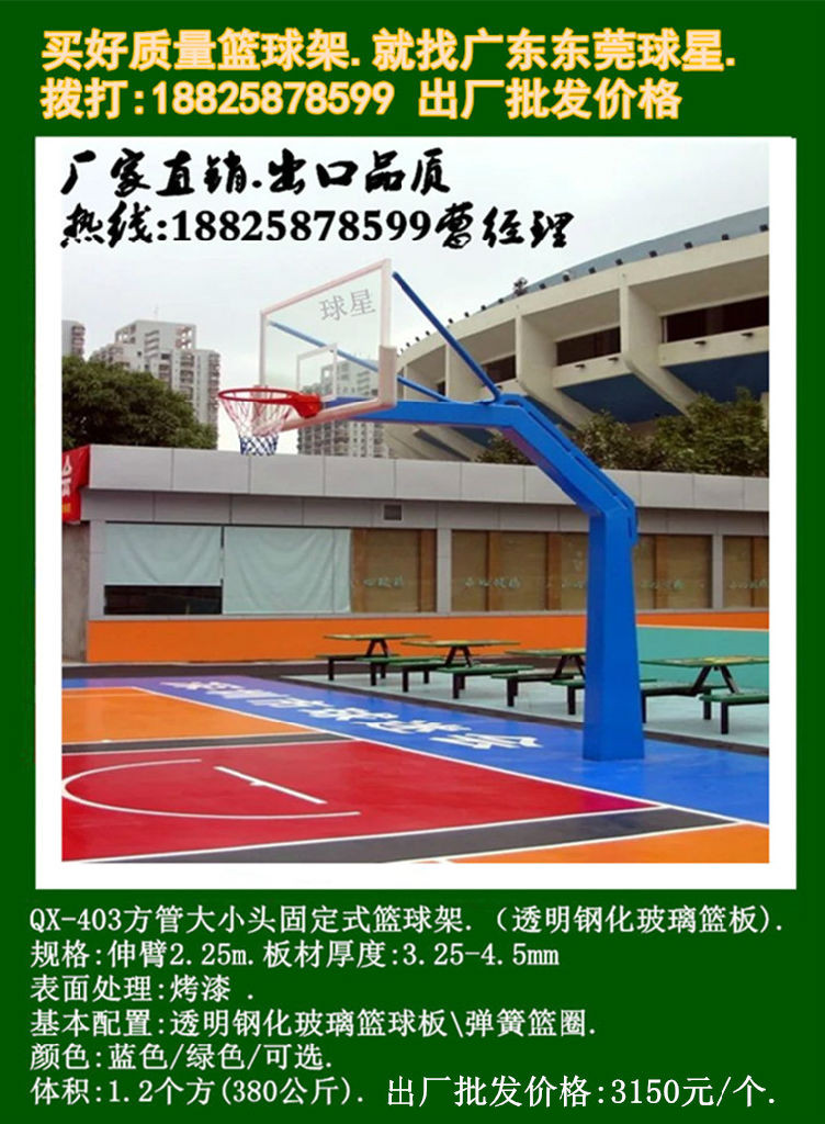 籃球架系列產(chǎn)品顏色為:綠色、藍色、可選.可根據(jù)用戶需求改變顏色,產(chǎn)品在沒有特別說明的前提下默認為根據(jù)庫存隨機從綠、藍兩種顏色中隨機抽取發(fā)貨。