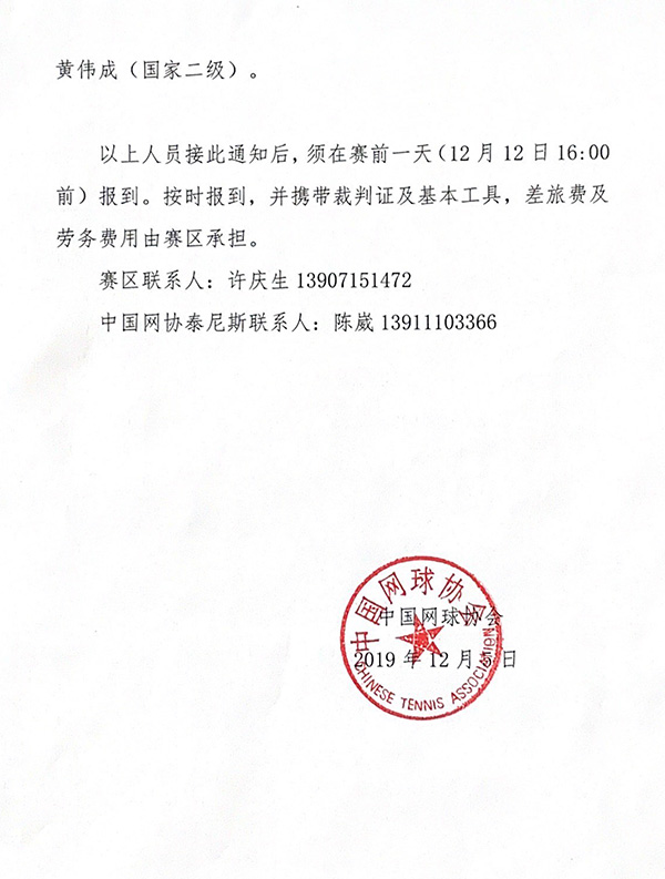 關(guān)于參加首屆中國網(wǎng)球巡回賽裁判員培訓(xùn)班的補(bǔ)充通知