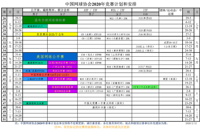 中國網(wǎng)球協(xié)會2020年競賽計劃和安排