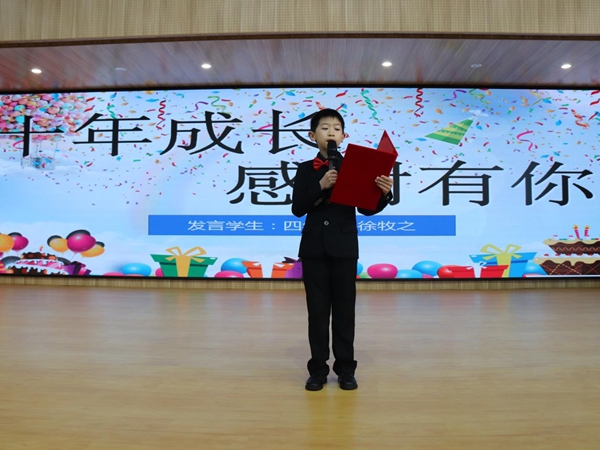 家長(zhǎng)代表發(fā)言時(shí),呼吁孩子們,要珍惜幸福的生活,感恩身邊的人!尊敬老師,是作為學(xué)生首先要做的事。十歲,是人生的第一個(gè)里程。十歲,是全新的起點(diǎn),十歲,是邁向新臺(tái)階的第一步!