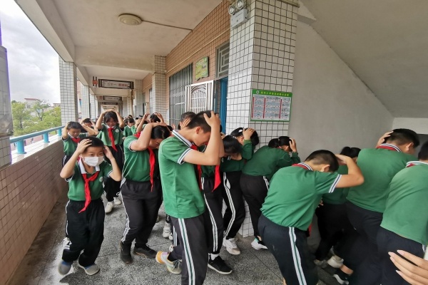 第二次警報響起時,學生在老師的指揮下,抱頭、彎腰、低姿、小步、快走、列隊經(jīng)指定疏散通道撤離教室,并按照疏散線路,迅速有序地撤離到學校操場“安全地帶”。
