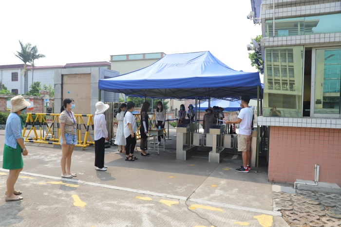 演練分為兩個場景進行。第一個場景在學(xué)校門口,學(xué)生分批錯峰到校。在正門設(shè)置晨檢區(qū)域、體溫檢測2條通道。返校學(xué)生間隔保持前后1米,有序排隊等待晨檢。在演練過程中,設(shè)計了兩種情況的演練方案。在監(jiān)測過程中,發(fā)現(xiàn)2名學(xué)生體溫異常,其中1人復(fù)測體溫正常,正常入班級上課。另一名體溫偏高的同學(xué)由值日教師帶到校門口臨時觀察區(qū)進行詢問并通知班主任和學(xué)校防疫工作小組等,最后通知家長安全把學(xué)生送去正規(guī)醫(yī)院治療。學(xué)校門口是學(xué)生進入學(xué)校的第一道屏障,安全、有序、正規(guī)的檢測確保每一個學(xué)生有一個健康的身體進行方可進入學(xué)校學(xué)習(xí)。