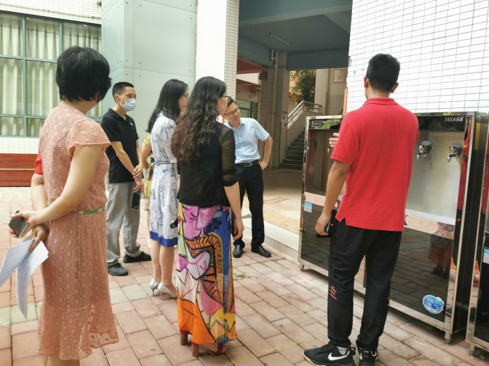 許嵐、熊海敏、盧展紅一行查看了校園環(huán)境布置,重點就新學(xué)期學(xué)生上學(xué)情況、老師人員就位情況、特殊個案生的關(guān)注以及學(xué)生心理健康、學(xué)校食品安全等方面進行了解。在走訪過程中,大家看到校園新進的飲水設(shè)備,便進一步就學(xué)生飲水健康安全、食品安全問題進行詢問。其中,許嵐主任特地問及了疫情期間飯?zhí)盟筒筒僮髁鞒蹋⒕褪称钒踩珕栴}、從貨源進貨、材料保存與加工、食品制作流程、飯?zhí)萌藛T健康等方面,事無巨細逐一詢問,確保師生安全無虞。