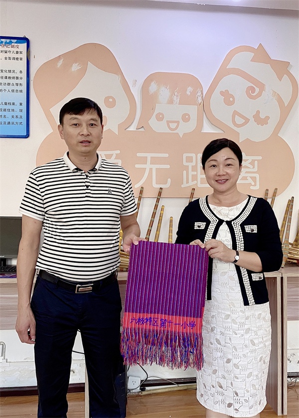 29日上午,學(xué)校的大課間活動,第十一小600多名學(xué)生們展示代表辦學(xué)特色、具有民族風(fēng)情的竹筒舞,展示了獨特的貴州民族文化,學(xué)生們的表演十分精彩。接著是到學(xué)校手工室的參觀活動。鄧海校長親自展示織布機的使用方法,最后還送給雍景園小學(xué)織好的繡有“六枝特區(qū)第十一小學(xué)”字樣的手工成品留作紀(jì)念。