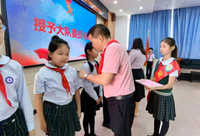 隨后,少工委主任何建明、副主任湯玨敏為新一屆學校大隊委員授予大隊委標志。“請黨放心,強國有我”慷慨激昂的誓言在校園回響,展現(xiàn)了少先隊員奮發(fā)向上、追求進步的精神風貌。他們將努力學習,為實現(xiàn)中華民族偉大復興的中國夢貢獻自己的力量!