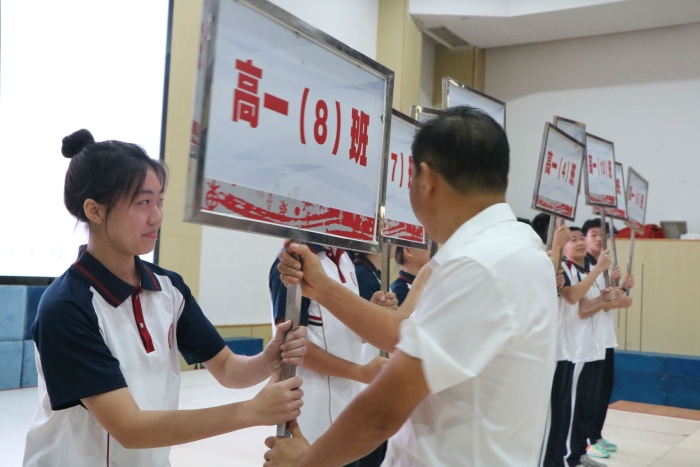 三位校長將沉甸甸的班牌交到了各班代表同學的手中。接過校長授予的班牌,就意味著我們的班級正式成立了。接過校長們授予的沉甸甸的班牌,也就接過了沉甸甸的責任。相信同學們在班主任們帶領下,能夠和睦相處,團結友愛,共同奮斗,希望每一個同學能發(fā)揚集體主義精神,維護班級榮譽,擔當應有責任。