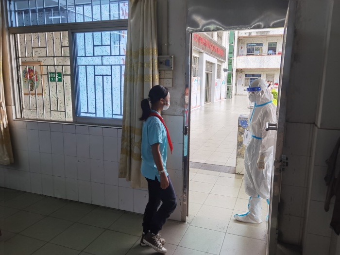 在本次演練活動(dòng)中,以學(xué)校接到阜沙鎮(zhèn)疾控部門(mén)通知,張三同學(xué)為新冠肺炎密切接觸者,通報(bào)學(xué)校后進(jìn)行相關(guān)應(yīng)急處理為背景,共有模擬啟動(dòng)應(yīng)急響應(yīng)、配合開(kāi)展流行病學(xué)調(diào)查、組織人員核酸采樣、組織管控對(duì)象轉(zhuǎn)運(yùn)隔離、校園封閉封控后的管理五個(gè)的場(chǎng)景。在演練中牛角小學(xué)接到通知后,學(xué)校校醫(yī)立即穿戴防護(hù)服到密接學(xué)生班級(jí),引領(lǐng)學(xué)生前往隔離室,并進(jìn)行流行病調(diào)查,同時(shí)醫(yī)療保障組封控管理該班師生。此時(shí)疫情防控工作領(lǐng)導(dǎo)小組成員到會(huì)議室召開(kāi)緊急會(huì)議,各防控小組積極響應(yīng)、配合,成功完成演練。