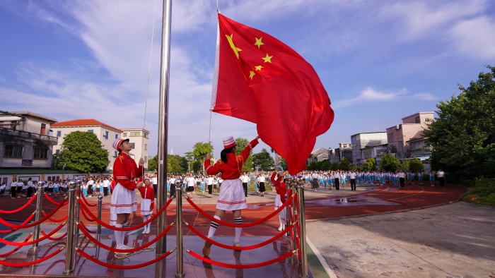 首先,全體師生進(jìn)行莊嚴(yán)的升旗儀式,共唱國(guó)歌。