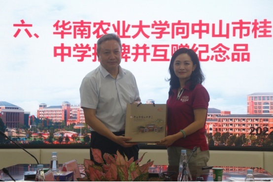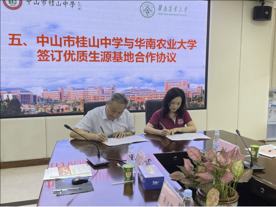 最后,董再明校長與周艷華書分別代表桂山中學(xué)和華南農(nóng)業(yè)大學(xué)簽訂了優(yōu)質(zhì)生源基地合作協(xié)議,并在掌聲中完成了授牌儀式。