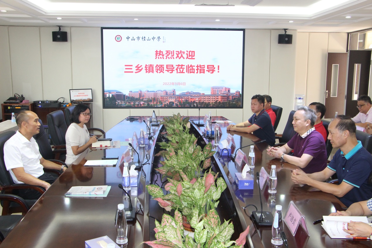 在育賢樓七樓會(huì)議室,校長董再明代表學(xué)校向領(lǐng)導(dǎo)匯報(bào)了學(xué)校取得的驕人成績。桂山中學(xué)圍繞立德樹人根本任務(wù),踐行“以人為本,卓越發(fā)展”理念,向高水平一流名校目標(biāo)不斷邁進(jìn)。近年,學(xué)校獲得國家防震減災(zāi)科普示范校、國防特色學(xué)校、全國中小學(xué)科研示范單位等國家級(jí)榮譽(yù),獲得廣東省書香校園、心理健康特色學(xué)校、五四紅旗團(tuán)委等省級(jí)榮譽(yù),正在積極創(chuàng)建廣東省文明校園。今年高考本科線上線達(dá)到95%,重點(diǎn)線約50%。今年中考招生錄取分?jǐn)?shù)線站穩(wěn)第一方陣并不斷攀升,和排名前三的學(xué)校差距大大縮小。同時(shí),董再明校長提出了學(xué)校目前存在的三點(diǎn)困難,希望三鄉(xiāng)鎮(zhèn)能夠給予幫助支持。