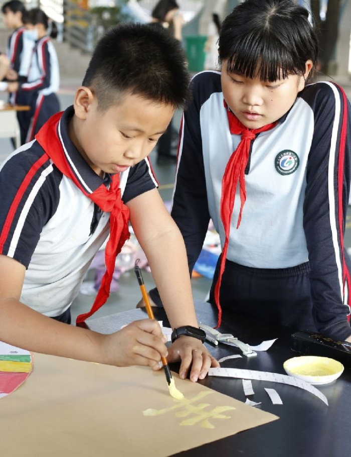 在活動開展前,美術(shù)老師先在各班開展小稿創(chuàng)作初賽評比并在班級擇優(yōu)選出6名學(xué)生代表班級比賽。比賽當(dāng)天,每班6名參賽選手現(xiàn)場合作繪畫出一幅全開尺寸的畫。美術(shù)科組長黎夢春老師在比賽前告知本次比賽要求并強調(diào)了創(chuàng)作內(nèi)容及構(gòu)思方向。曹二小學(xué)校長邱波宣布比賽活動開始。
