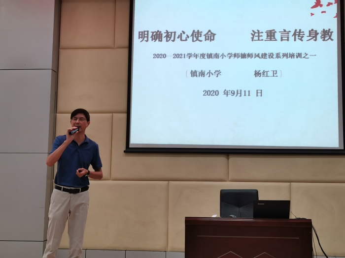 為進(jìn)一步貫徹黨的教育方針,推進(jìn)師德師風(fēng)建設(shè)活動的深入開展,9月11日,鎮(zhèn)南小學(xué)楊紅衛(wèi)校長在報告廳召開了以“強(qiáng)師德,正師風(fēng),鑄師魂”為主題的師德師風(fēng)專題培訓(xùn)會,全體教師參加了此次會議。