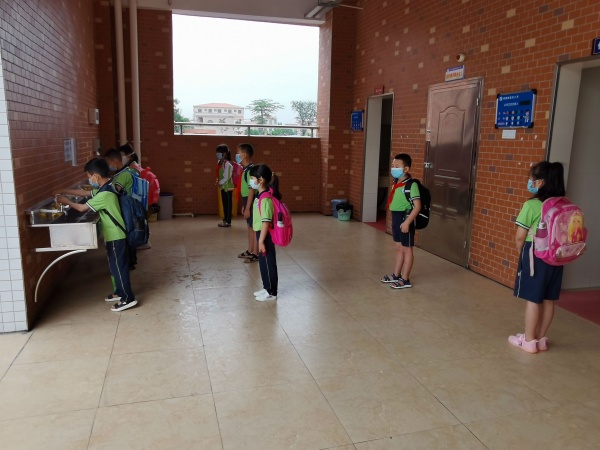 早晨七點,學(xué)校行政人員和全體教職工各司其職,在不同崗位等候吳欄小學(xué)學(xué)子們歸來。校園門口體溫監(jiān)測通道準(zhǔn)時開啟,同學(xué)們按照學(xué)校報到要求,陸續(xù)錯峰返校。他們佩戴口罩,根據(jù)地面標(biāo)示線,有序間隔一米距離排隊。負(fù)責(zé)體溫檢測的老師逐一檢測同學(xué)們的體溫,測溫正常的同學(xué)們回到班級所在樓層洗手處進(jìn)行洗手,只見同學(xué)們認(rèn)真地按照“七步洗手法”洗刷他們的稚嫩的小手,然后按照指定通道進(jìn)入教室。